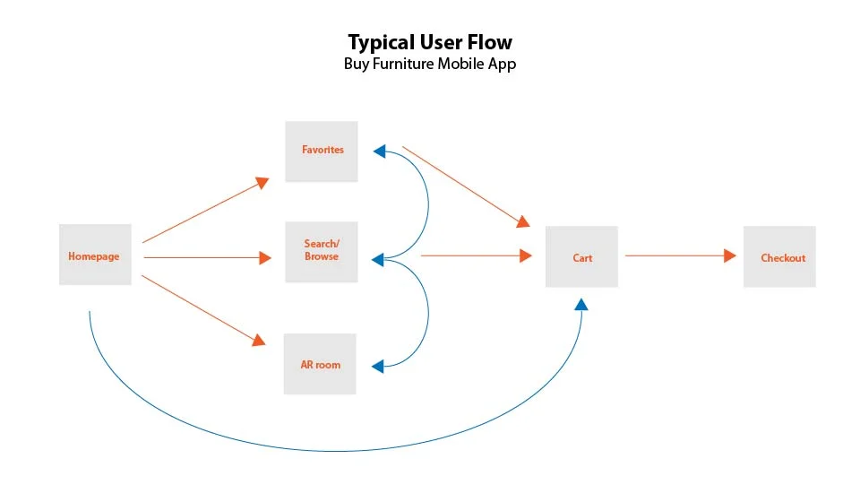 After framing the story of how Alfred would shop from beginning to end, I mapped the components needed to complete this furniture shopping task in a flow diagram. I started out with stickies and white board marker while creating the user flow. It makes each step of the user journey easily adjustable in the case that you change your mind and want to place one of the stickies in a different part of the journey. I originally only mapped how the user would browse items, test them in the AR room, and add to the cart. For a more delightful experience, I added nice-to-have pieces such as a place to bookmark items and quickly access them (a favorites list). This favorites list was also meant to allow the user to easily compare all bookmarked products in AR at once. The user is able to save time without having to switch in and out of AR mode.